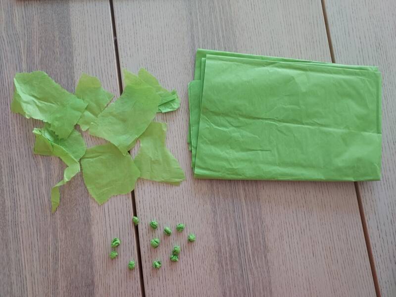 Etape 2: Découpe de petits carrés de papier de soie vert et roule les pour en faire de toutes petites boules.